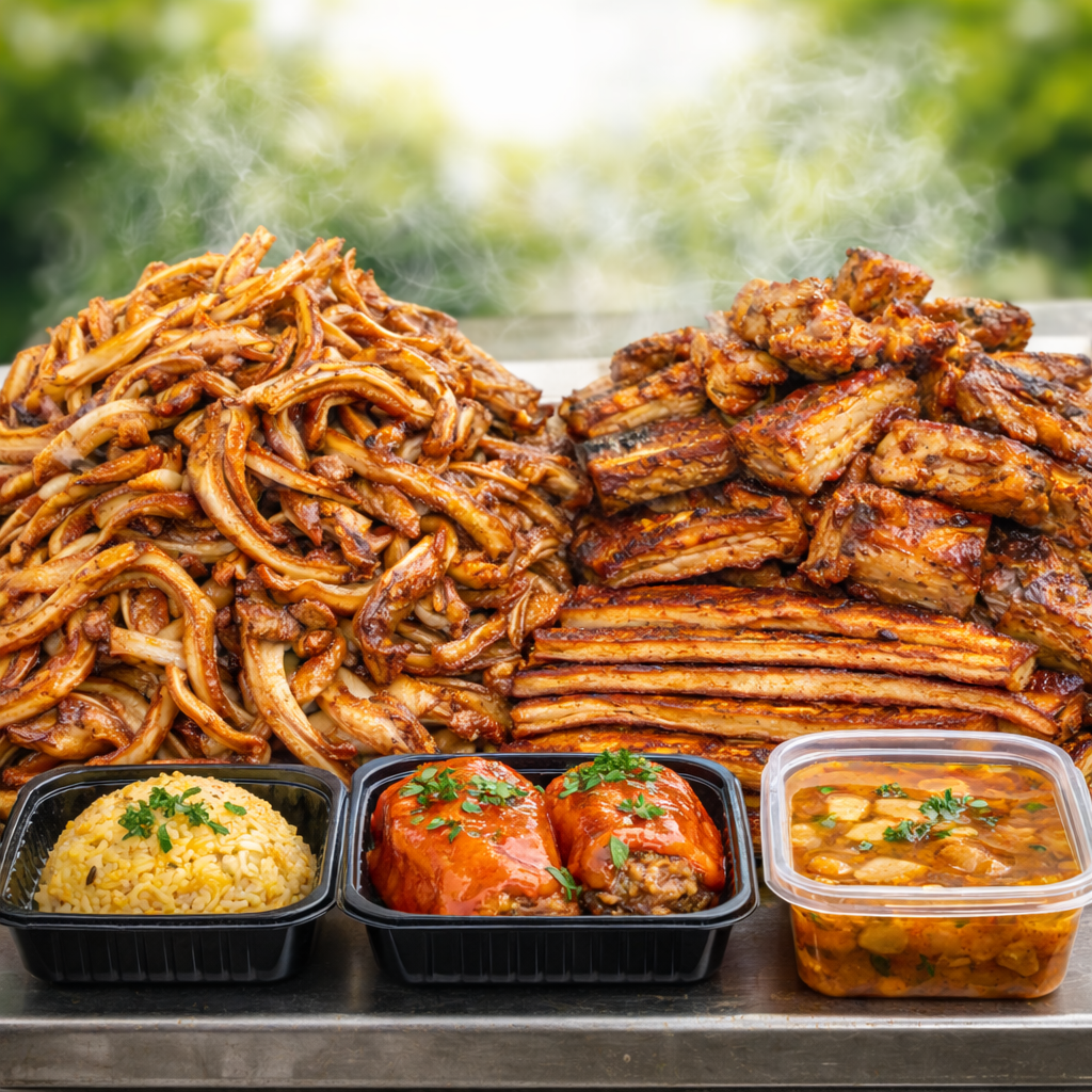 Топлината на огъня — за вкъщи. Всичко е прясно: сготвено, изпечено, изкарано от жаравата преди минути. Ребра, месо, гозби — вкус като за празник. А ако имаш час, план или повод — ние го приготвяме специално за теб, точно когато ти трябва.