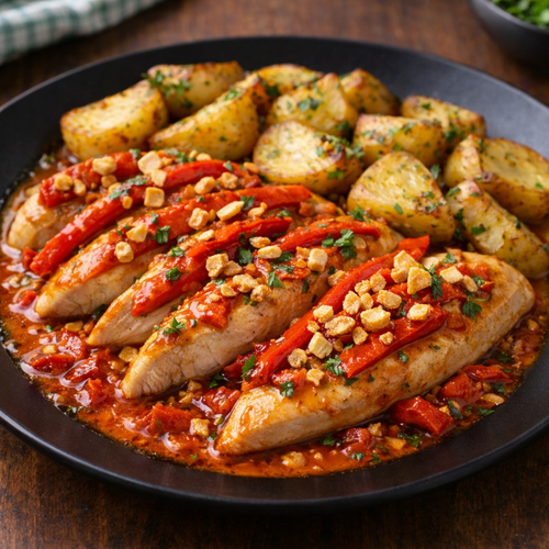 Пилешко филе,чушки,чесън,маслен сос и картофено пюре