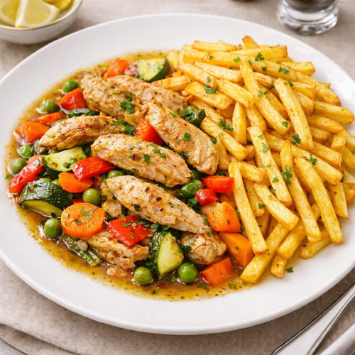 пилешно филе,морков,тиквичка,лук,чушка, катрофи