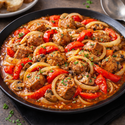 Свински врат,лук,чушки,домати,подправки