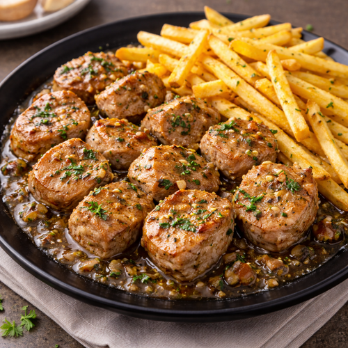 задушено свинско контрафиле , чесън , пържени картофи