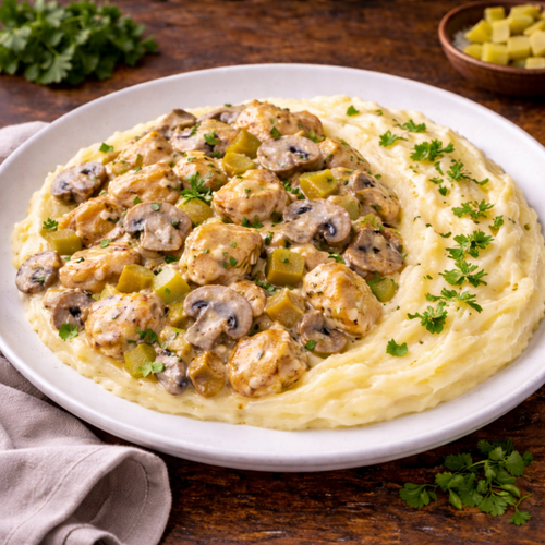 Задушено филе,сметана,губи,синьо сирене и домапно картофено пюре